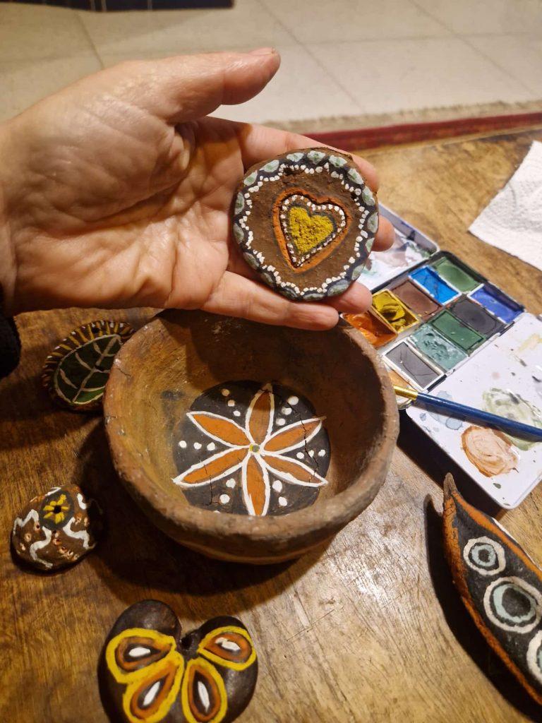 לאחר מכן נמשיך לציור בצבעים טבעיים על לב מאדמה – מפגש אישי עם החומר, הצבע והתהליך.